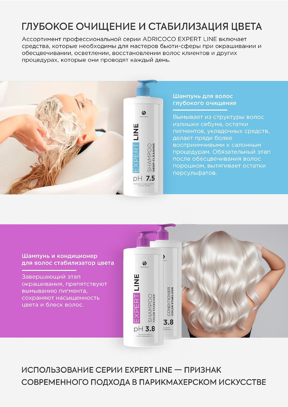 Небольшое количество средства нанесите на влажные волосы, вспеньте массирующими движениями в течение 2 минут, распределите по всей длине. Смойте теплой водой. Для максимального эффекта используйте с кондиционером для волос стабилизатором цвета ADRICOCO EXPERT LINE.