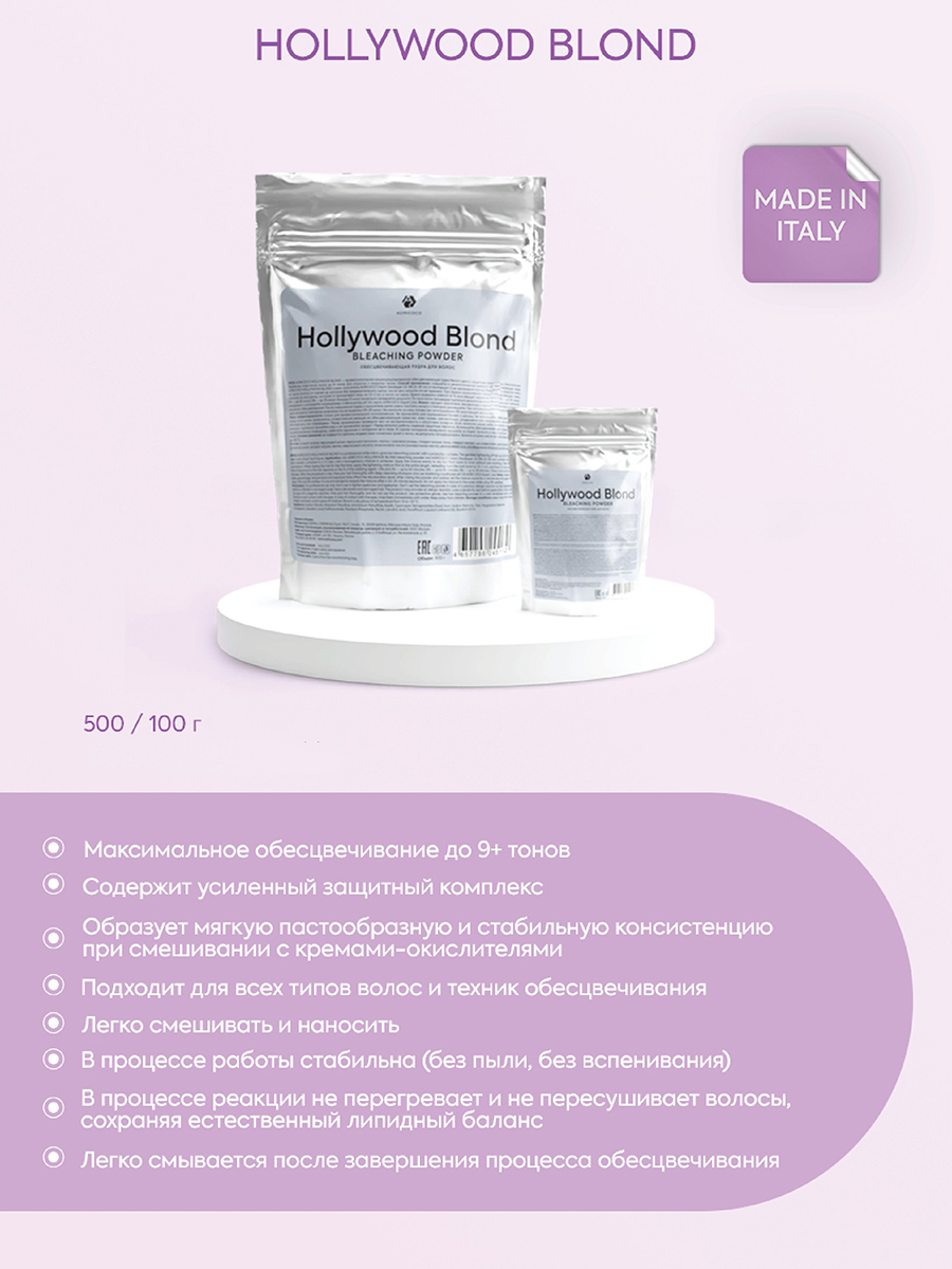 Hollywood Blond - обесцвечивающая пудра для волос максимальное обесцвечивание до 9+ тонов. Содержит усиленный защитный комплекс. Образует мягкую пастообразную и стабильную консистенцию при смешивании с кремами-окислителями.