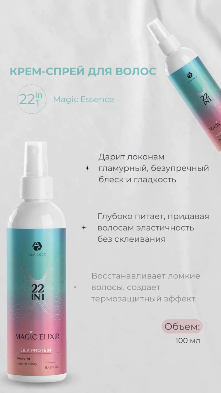 - Мультифункциональный крем-спрей для волос ADRICOCO 22 в 1 MAGIC ELIXIR.