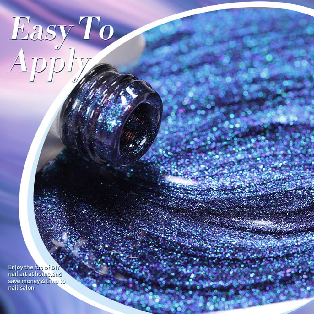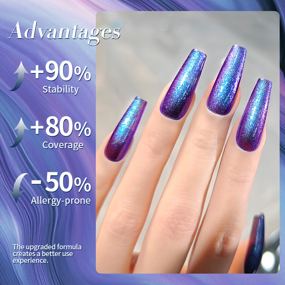 Формула гель-лака обеспечивает легкое нанесение без разводов, ровное покрытие и стойкость до 3 недель без потери интенсивности мерцающего эффекта.