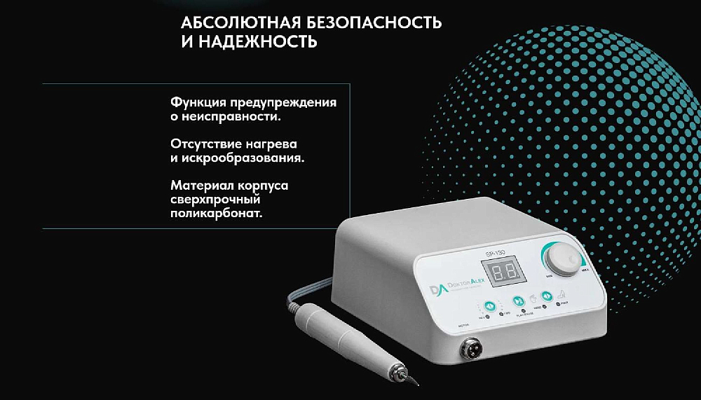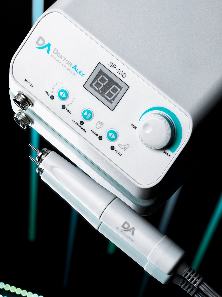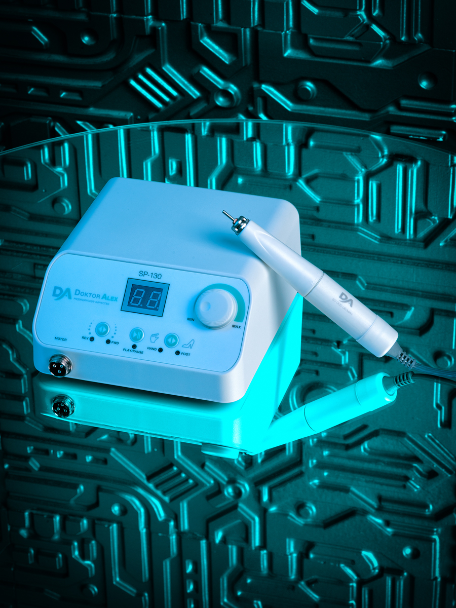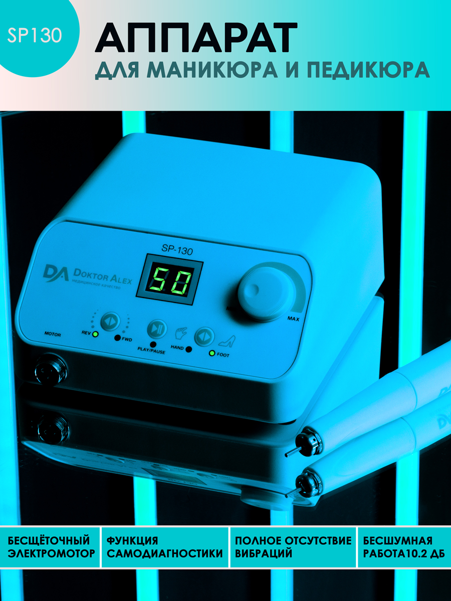 Dr Alex SP-130 предназначен для выполнения аппаратного маникюра и педикюра на большом потоке. Аппарат оснащён электронным дисплеем, функциями диагностики и предупреждения о неисправности, переключения направления вращения электромотора без снижения оборотов, пуск/пауза, функция регулировки скорости вращения с помощью педали. Благодаря современным технологиям и качественным комплектующим удалось достичь максимальной надёжности, безопасности и долговечности устройства. SP-130 оснащён бесщёточным наконечником, который имеет ряд таких преимуществ как: тихая работа, отсутствие вибраций, небольшой вес, высокий показатель крутящего момента, отсутствие нагрева, а также стабильная и бесперебойная работа при критических нагрузках.