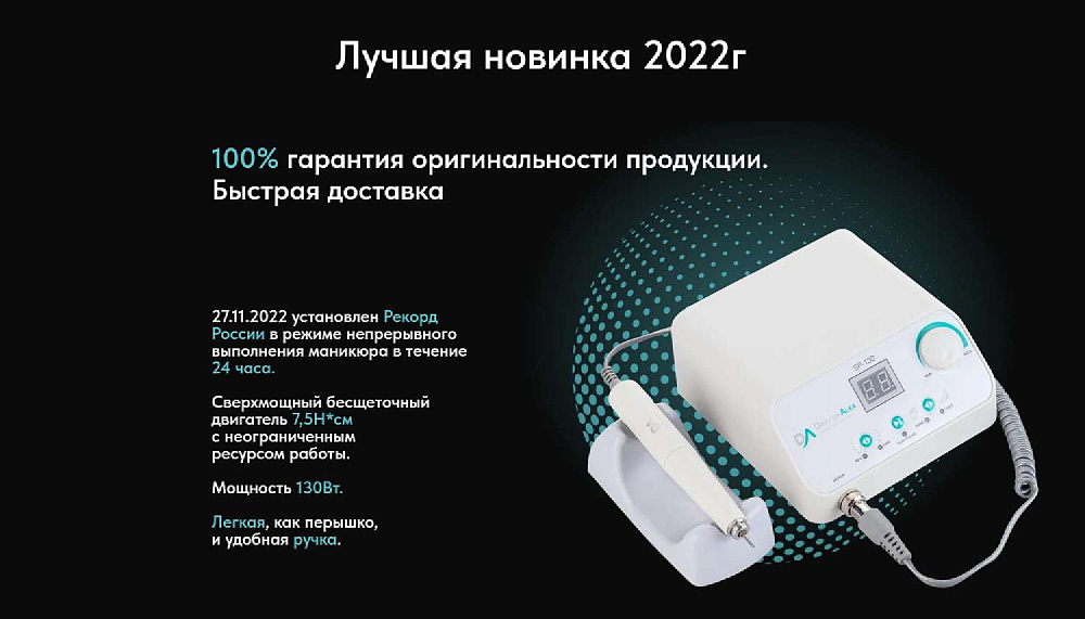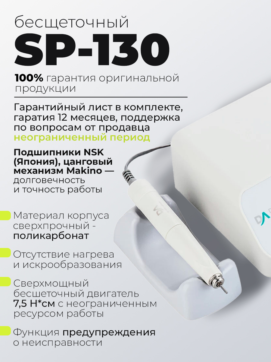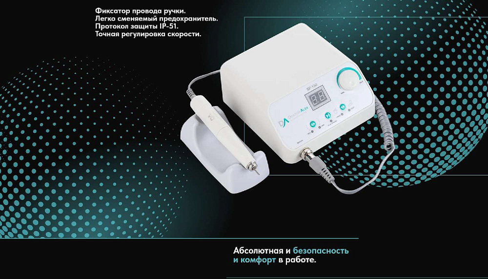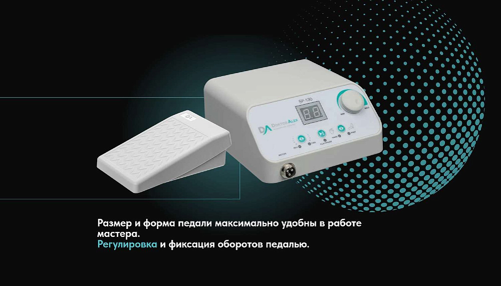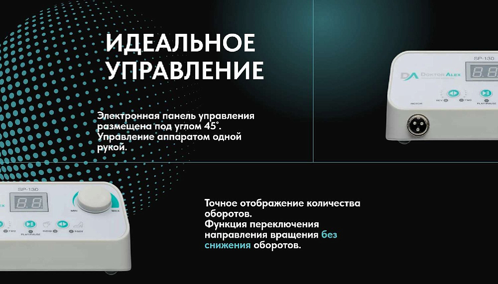 Dr Alex SP-130 предназначен для выполнения аппаратного маникюра и педикюра на большом потоке. Аппарат оснащён электронным дисплеем, функциями диагностики и предупреждения о неисправности, переключения направления вращения электромотора без снижения оборотов, пуск/пауза, функция регулировки скорости вращения с помощью педали. Благодаря современным технологиям и качественным комплектующим удалось достичь максимальной надёжности, безопасности и долговечности устройства. SP-130 оснащён бесщёточным наконечником, который имеет ряд таких преимуществ как: тихая работа, отсутствие вибраций, небольшой вес, высокий показатель крутящего момента, отсутствие нагрева, а также стабильная и бесперебойная работа при критических нагрузках.
