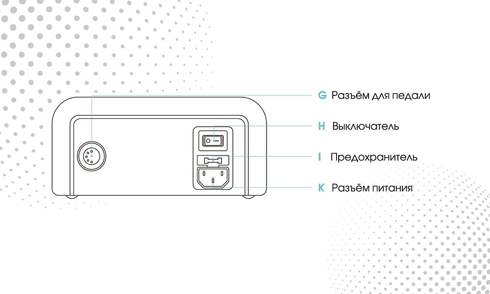- Для того, чтобы выбрать режим активации наконечника с помощью педали для ноги, нужно подключить педаль к разъему «I» и нажать клавишу «L» - должен загореться индикатор зелёного цвета. Это означает, что режим активирован. С помощью регулятора оборотов «К» установить необходимую скорость вращения микромотора;