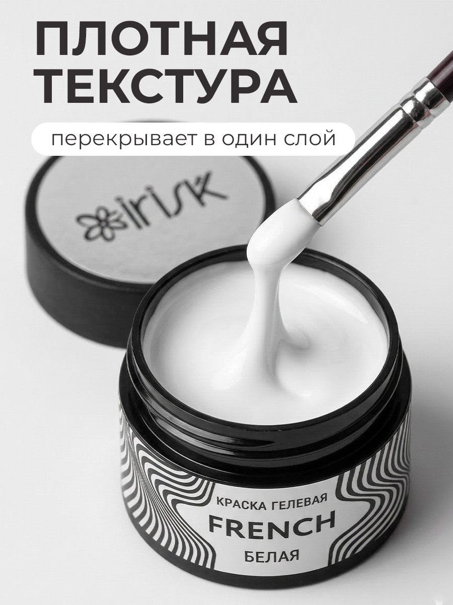 Гелевая краска French комфортно наносится, хорошо распределяется по поверхности ногтевой пластины, отлично просыхает. Покрытие, созданное при помощи French-краски Irisk, не трескается и не скалывается. Имеет липкий слой, наносится под покрытие TOP.