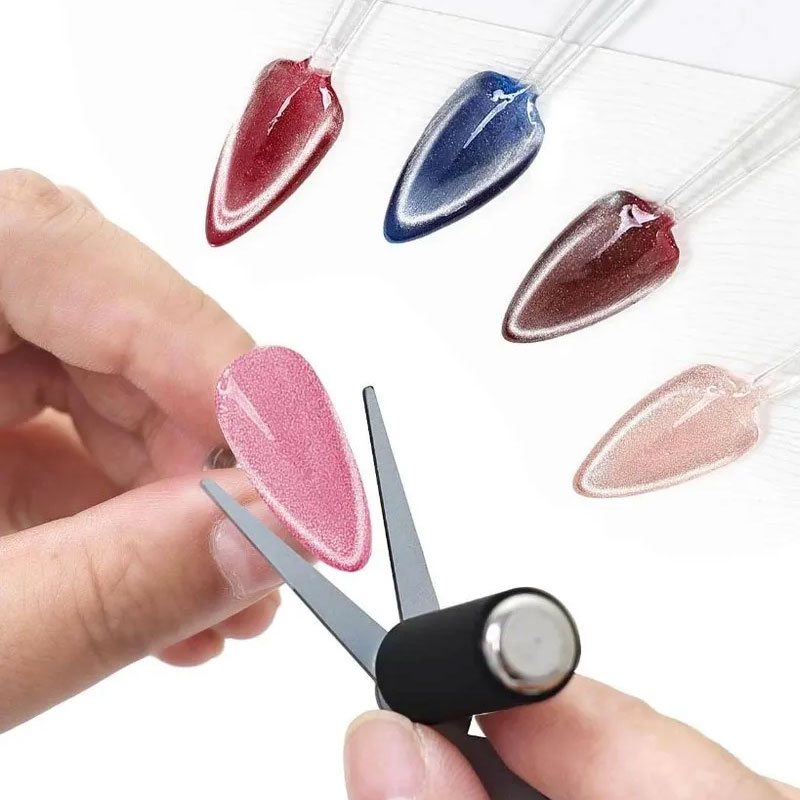 Необходимо как можно ближе поднести магнит нужной стороной к только что накрашенному невысохшему ногтю не прикасаясь к поверхности. Примерное расстояние - 1 мм. Удерживайте магнит над ногтем в течение 5-10 секунд, металлические частицы гель-лака будут собираться, образуя узор. После получения нужного эффекта, просушите покрытие в лампе.