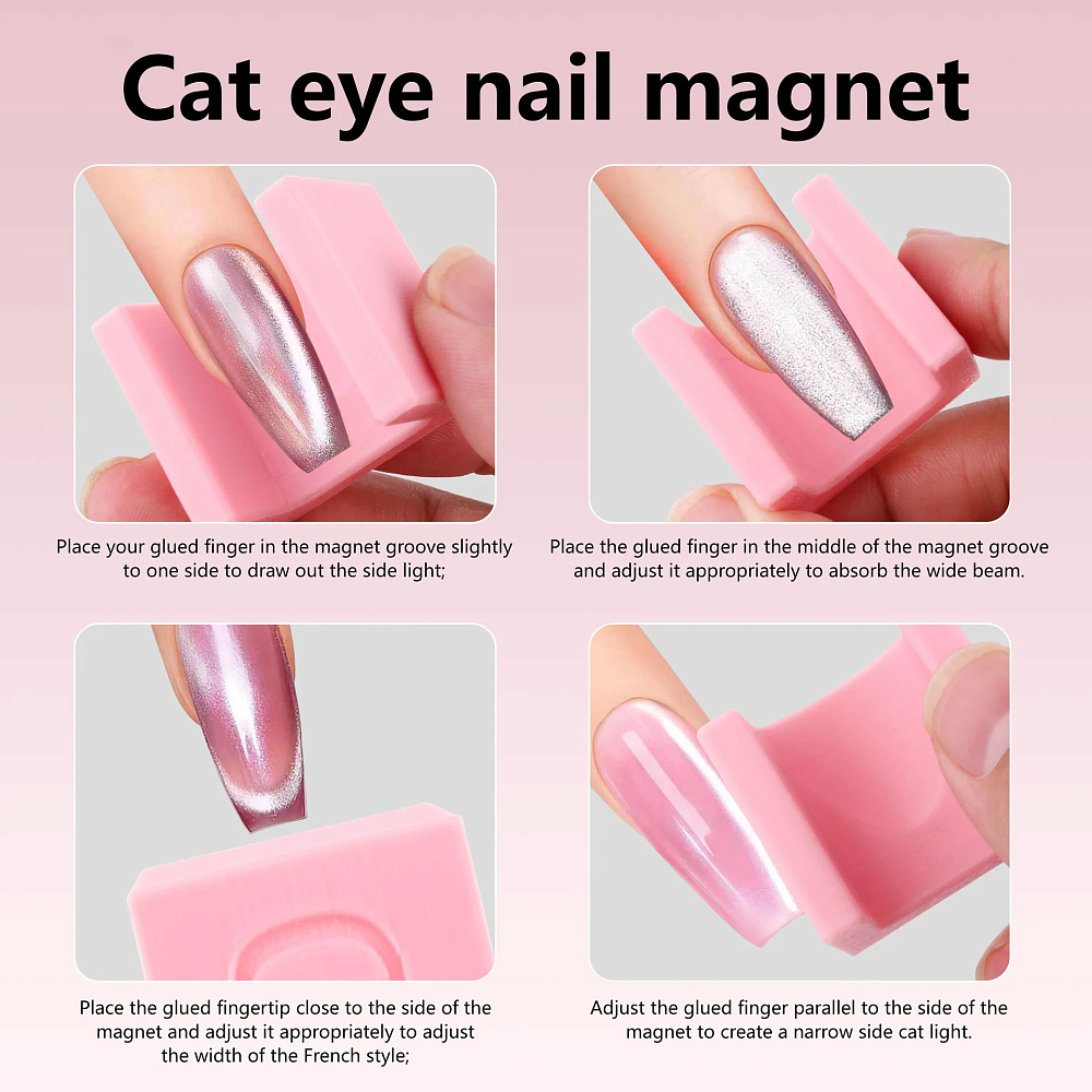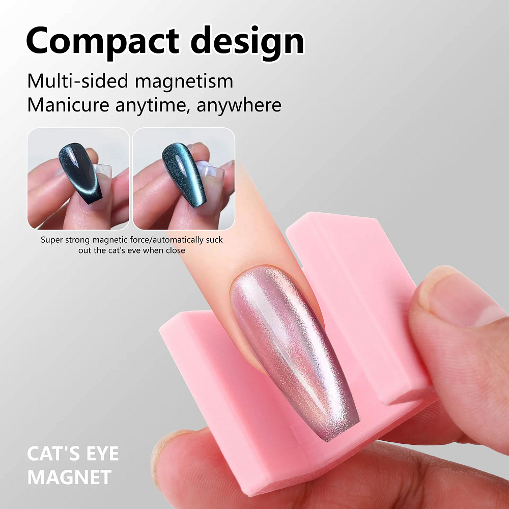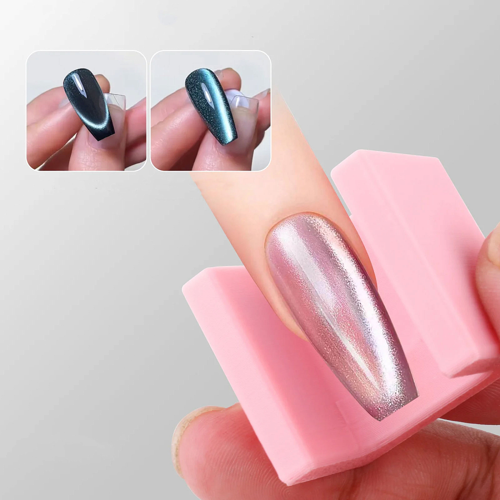 Аксессуар разработан для выполнения nail-арта с покрытиями хрустальная водная сатиновая кошка", гарантируя безупречный финиш, стабильность и удобство применения, расширяя возможности выполнения дизайнов с гель-лаками "кошачий глаз". Усиленный двухсторонний магнит представляет собой устойчивую П-образную подставку с мощными встроенными неодимовыми магнитами. Его не нужно держать в руке - просто поместите ноготь внутрь конструкции и наслаждайтесь равномерным, профессиональным результатом распределения магнитных частиц без разрывов и смазанного рисунка. Магнит зафиксирован, поэтому дрожание рук и нечеткие линии исключены.