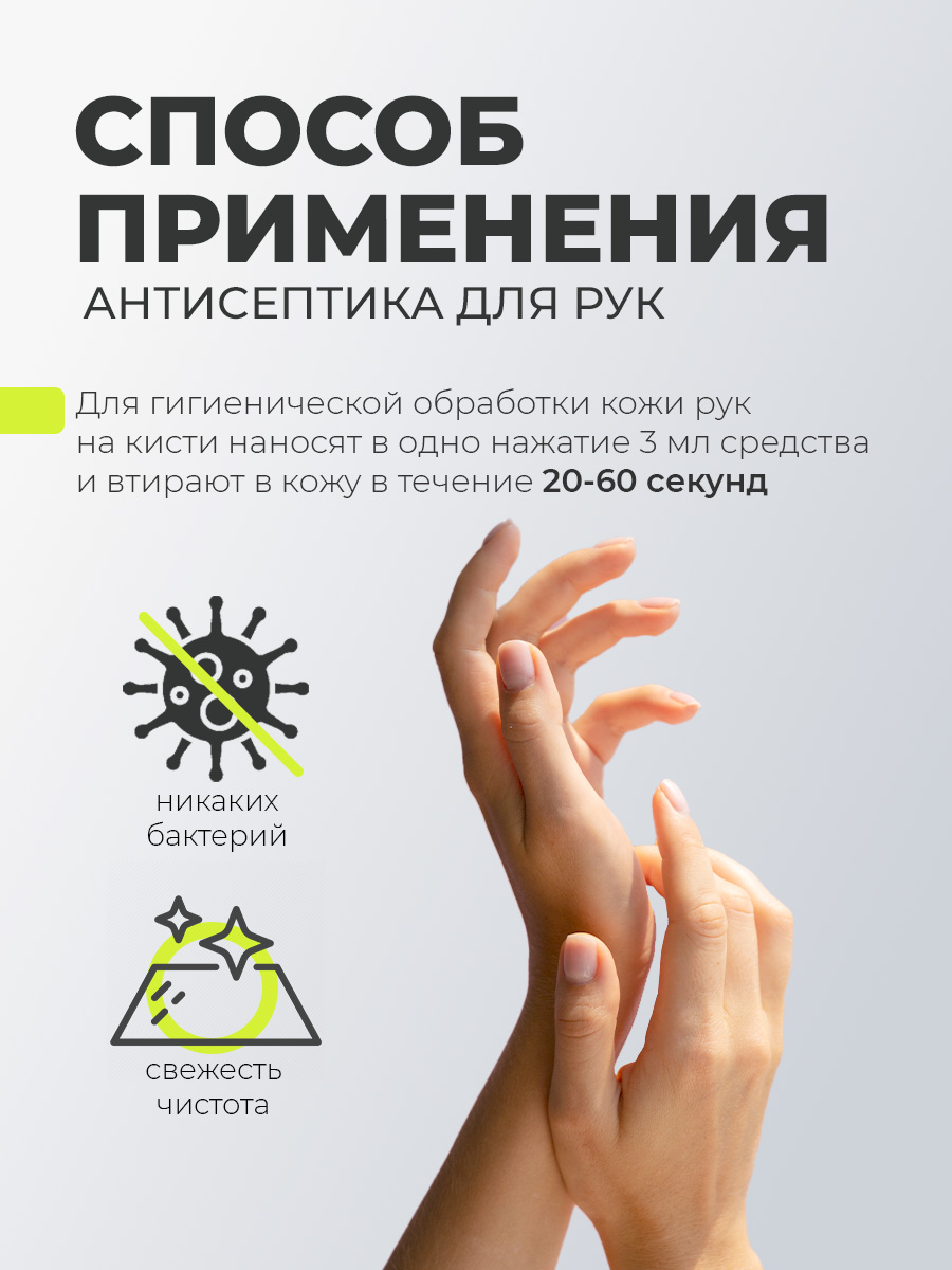 Для гигиенической обработки кожи рук на кисти наносят в одно нажатие 3 мл средства и втирают в кожу в течение 20 секунд.
