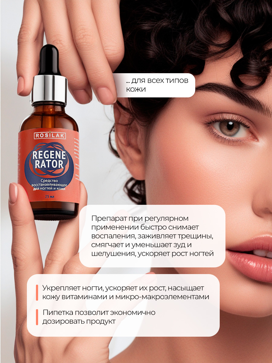 Препарат при регулярном применении быстро снимает воспаления, заживляет трещины, смягчает и уменьшает зуд и шелушения, вызванные аллергическим дерматитом (сухой дерматит, атопический дерматит или проявление аллергии на гель-лак или жидкости для его нанесения/снятия). Также он показывает высокую результативность при лечении грибковых заболеваний ногтей, механических повреждений, старых травм ногтевой пластины или результата перепиливания либо ожога ногтевой пластины. Регенератор улучшает состояние проблемной кожи, повышая ее защитные свойства, восстанавливает кожный иммунитет. Препарат восстанавливает ногтевую пластину при дистрофиях ногтей, способствует укреплению ослабленных ногтей и ускоряет их рост, возвращает здоровый вид, насыщает кожу витаминами А, Е, К и микро- макроэлементами.