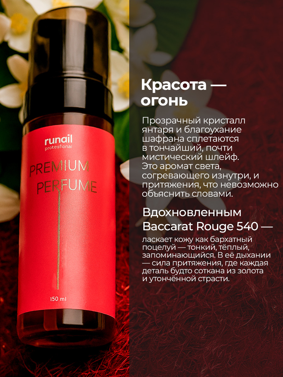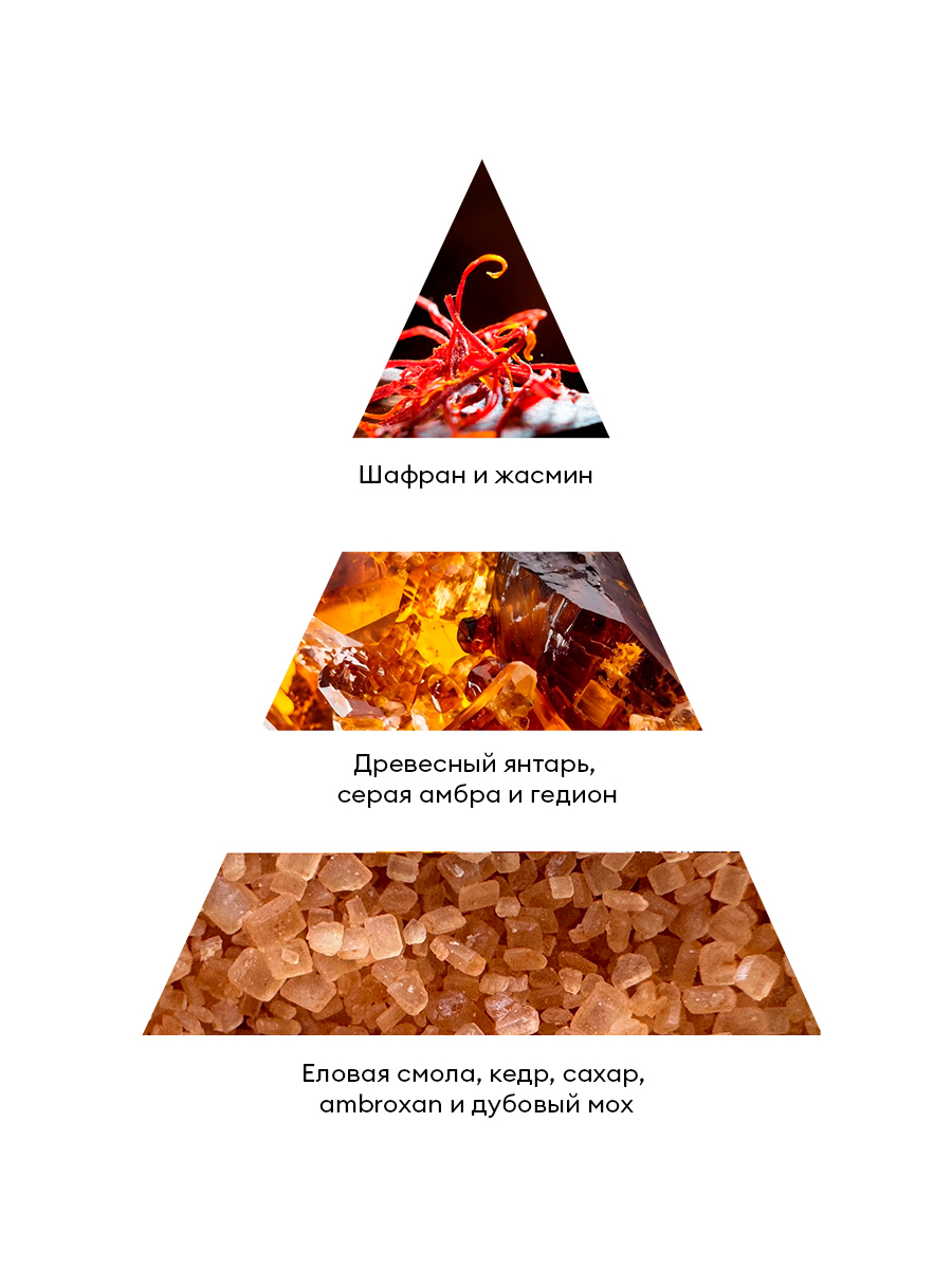Он открывается нотами шафрана и жасмина, которые придают композиции пикантность и насыщенность. В сердце аромата звучит древесный янтарь, добавляющий мягкости и глубины.
