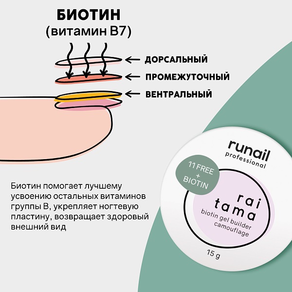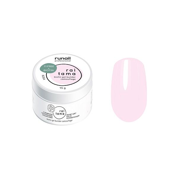 Камуфлирующий BUILDER GEL с биотином поддерживает действие базы с витамином В7 на протяжении всего срока жизни маникюра.