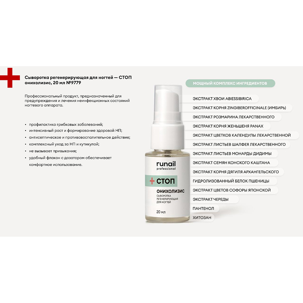 Сыворотка содержит мощный комплекс из тринадцати натуральных ингредиентов, включая экстракт монарды, который способствует быстрому восстановлению повреждённых или ослабленных ногтей. Также в составе присутствуют антибактериальные и противогрибковые компоненты, предотвращающие повторное появление проблем с ногтями.