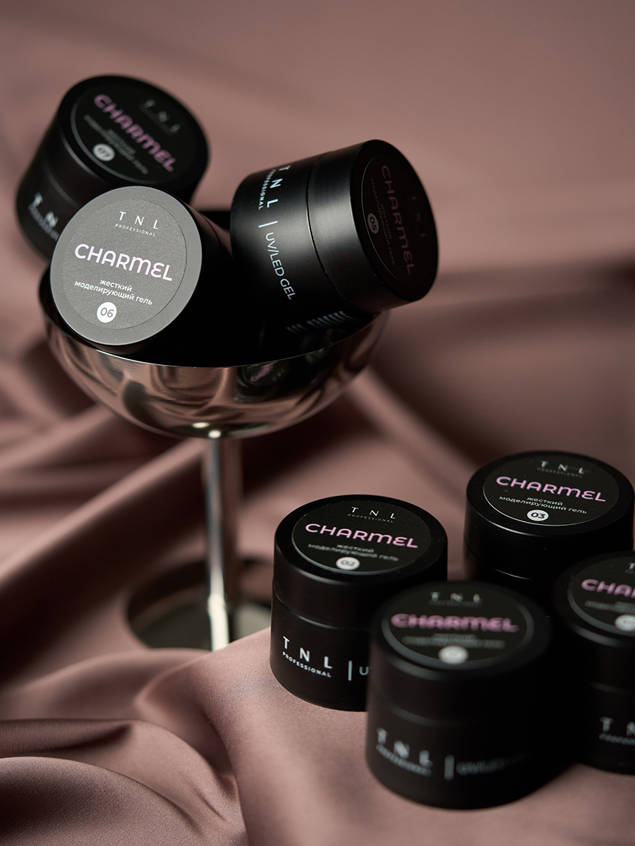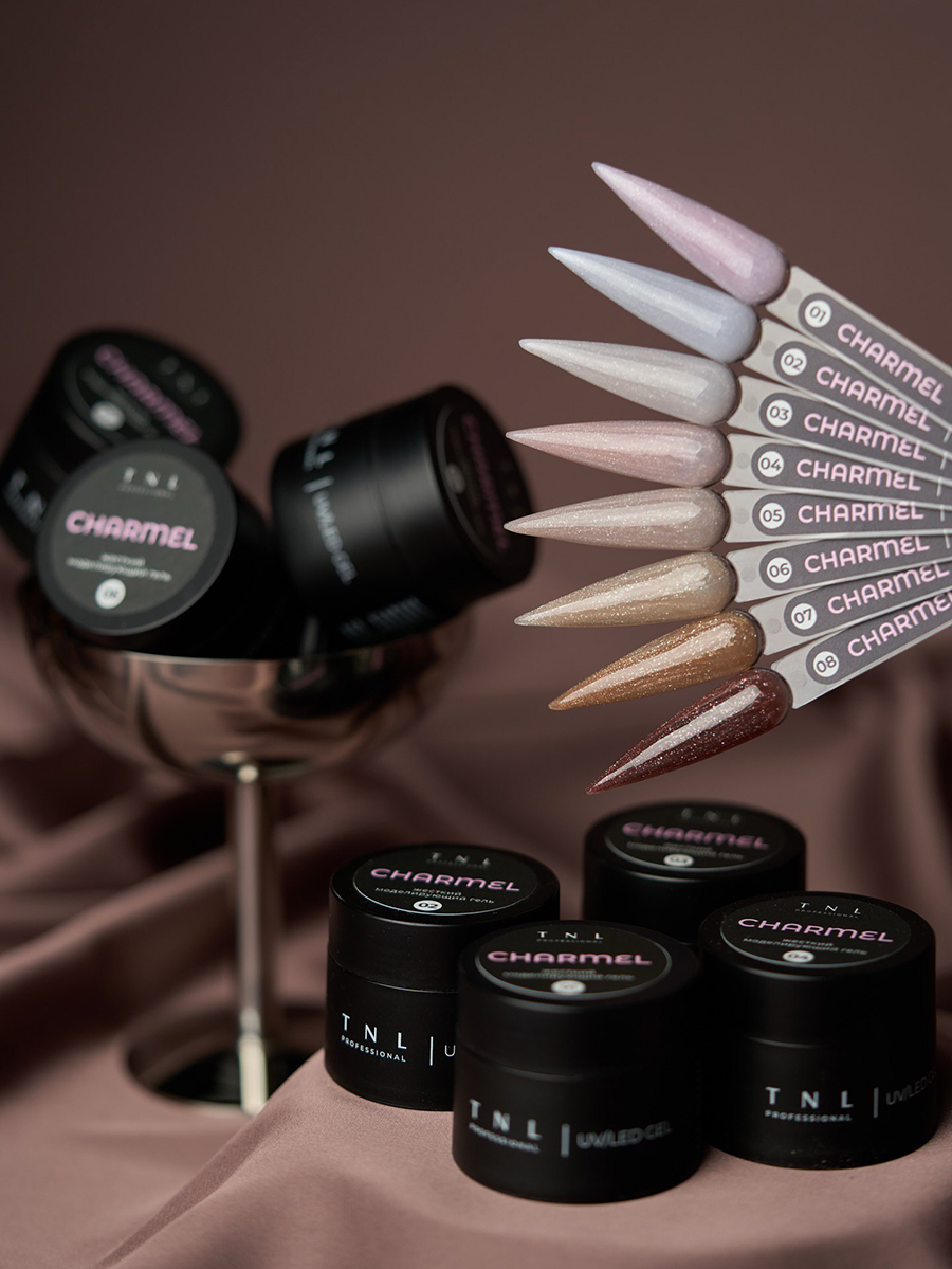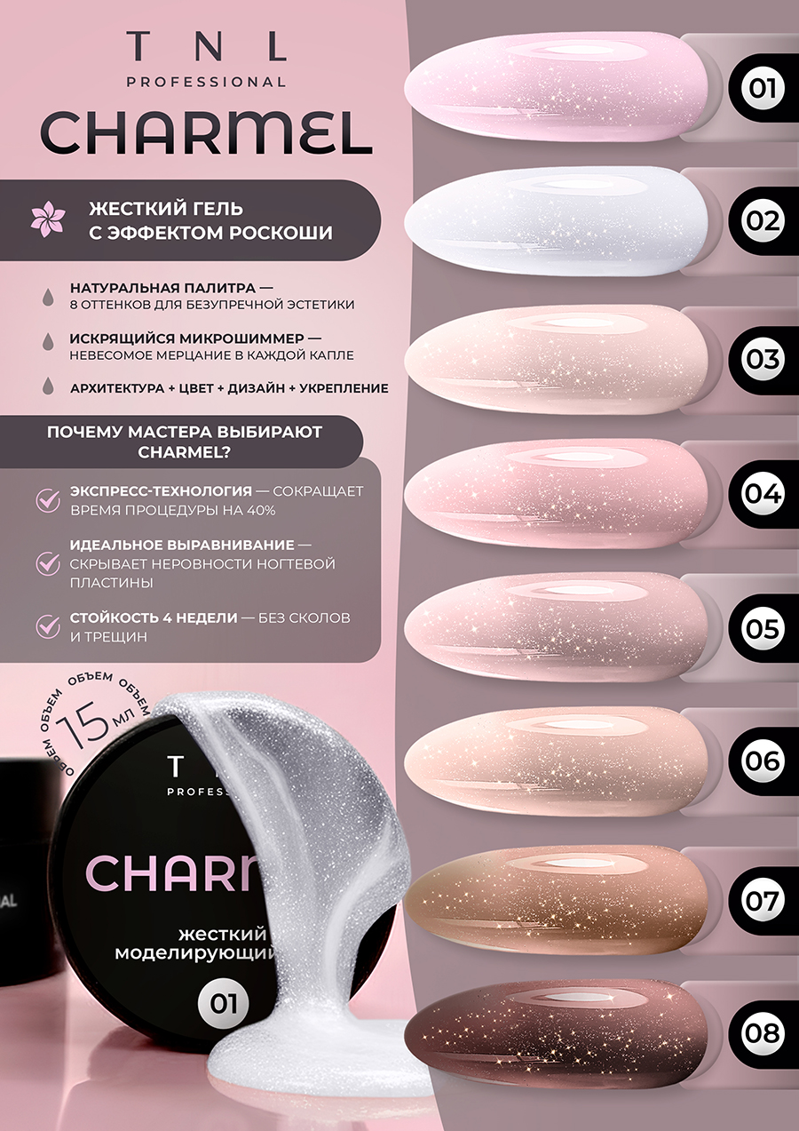 Жесткий гель для наращивания с шиммером "Charmel" бренда TNL в объеме 15 мл.