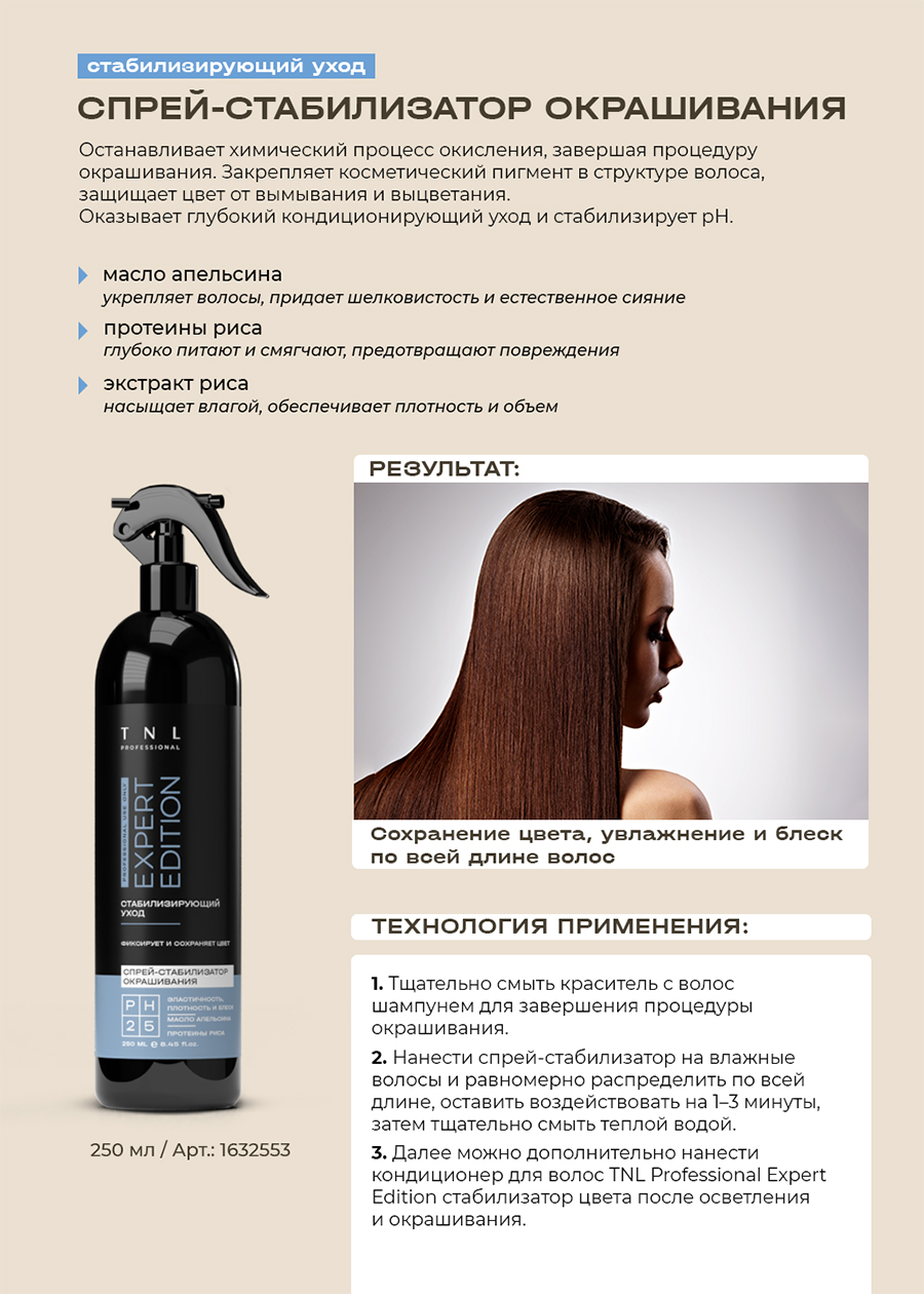 Спрей-стабилизатор окрашивания с маслом апельсина и протеинами риса линейки "Expert Edition" бренда TNL в объеме 250 мл