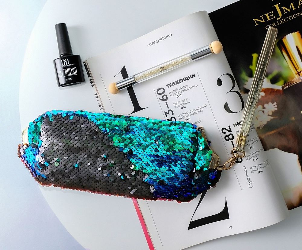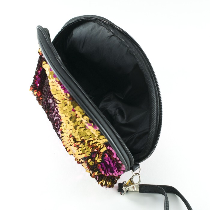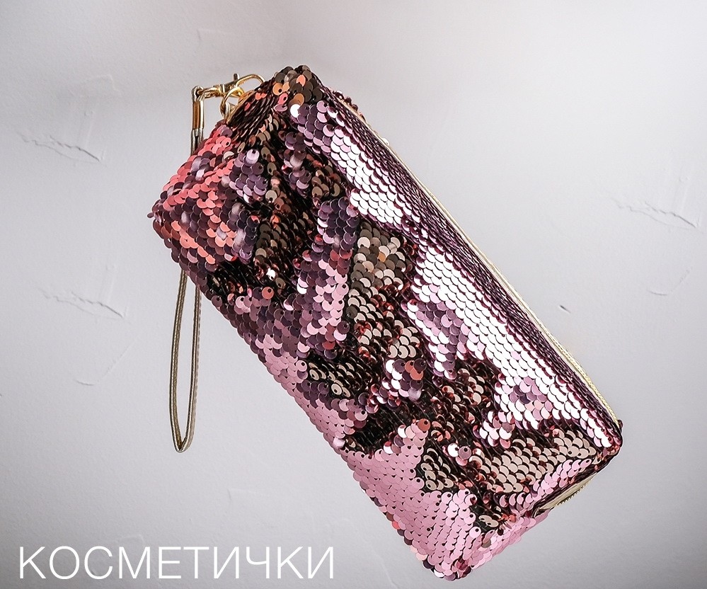 Вместительная и компактная прямоугольная косметичка на молнии в стильном, ярком, оригинальном дизайне предназначена для упорядочивания и удобного хранения аксессуаров, косметики, важных мелочей. Она изготовлена из текстиля (материал подкладки - полиэстер, внешний корпус - из полиуретана), декорирована разноцветными пайетками, переворачивая которые можно легко менять расцветку этого незаменимого для девушки аксессуара. Косметичка имеет два боковых кармана, снабжена ручкой-петелькой, позволяющей при необходимости носить изделие на руке. Параметры: высота - 11 см, длина (самая длинная часть) - 25 см, ширина - 9,5 см.