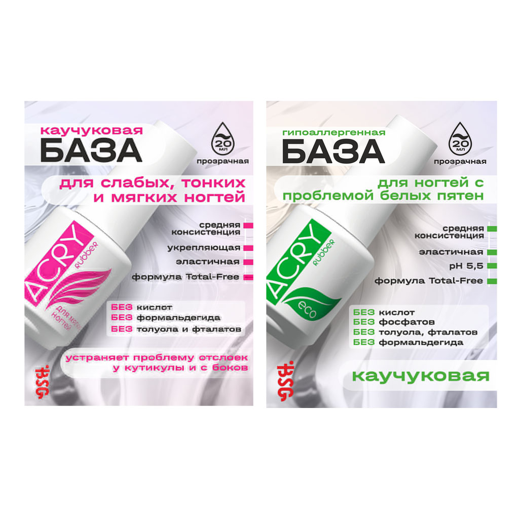 Эластичные базы для проблемных ногтей ACRY Rubber и ACRY Rubber ECO от BSGСозданные по специально разработанным формулам материалы идеально сцепляются с мягкими ногтями и обеспечивают прекрасную носку жестких покрытий. Подходят в качестве подложки под любые жесткие системы, не наносят вреда ногтевой пластине даже при длительной носке, не вызывают пересушивания ногтевой пластины и химического ожога. Основы гипоаллергенны, подходит клиентам с аллергией на "обычные" базы.